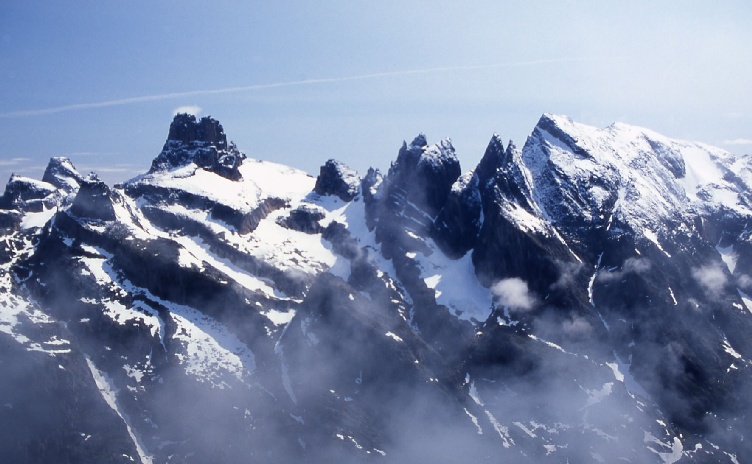 View East after a light snow fall, to the East side of the fjord. Pt1350m is the rightmost of the cluster of peaks right of centre.