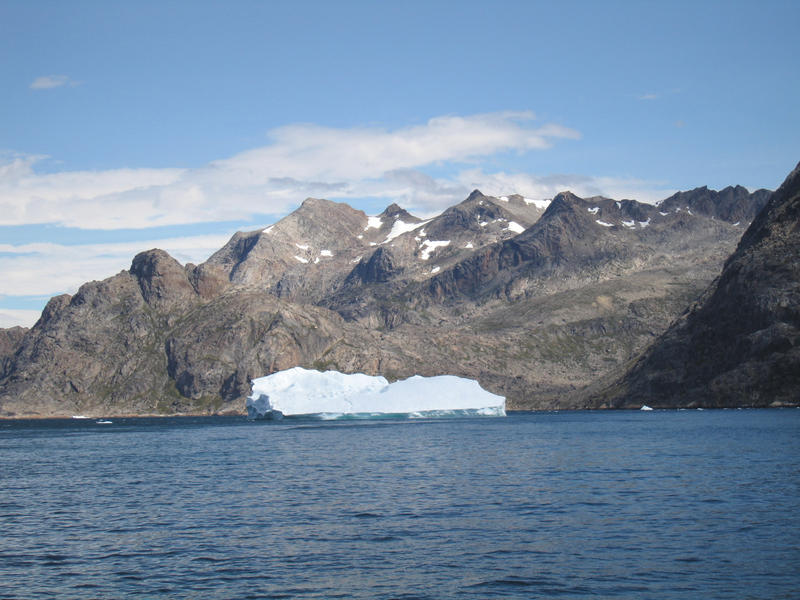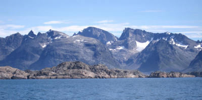 Tornarssuk from the Sea on the approach. 1388m at the back centre. [D.Bone]